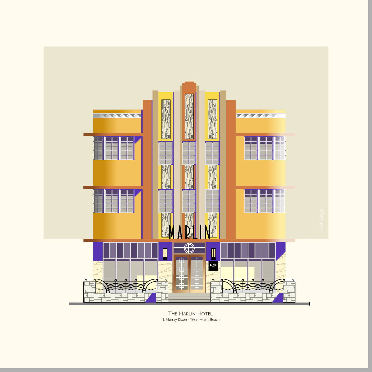 Illustrations of the famous ART DECO buildings of South Beach by Lex George Architect & Illustrator